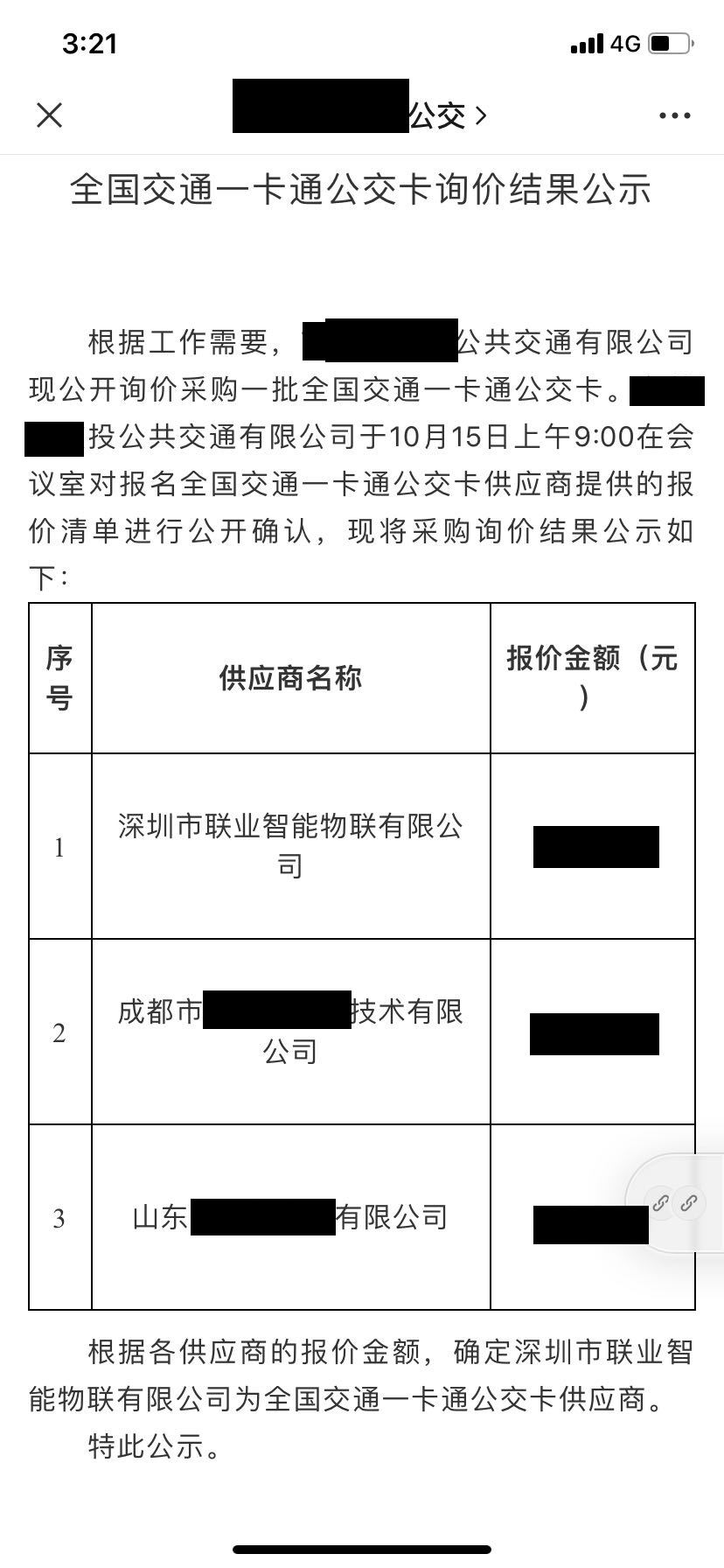 2020年10月15日我司(深圳市聯(lián)業(yè)智能物聯(lián)有限公司)在《全國交通一卡通公交卡》的招標項目的競標中,憑借過硬的產(chǎn)品質(zhì)量,扎實高效的工作作風和良好的企業(yè)信譽,以絕對優(yōu)勢順利中標,在此特向和廣大新老客戶分享喜訊。