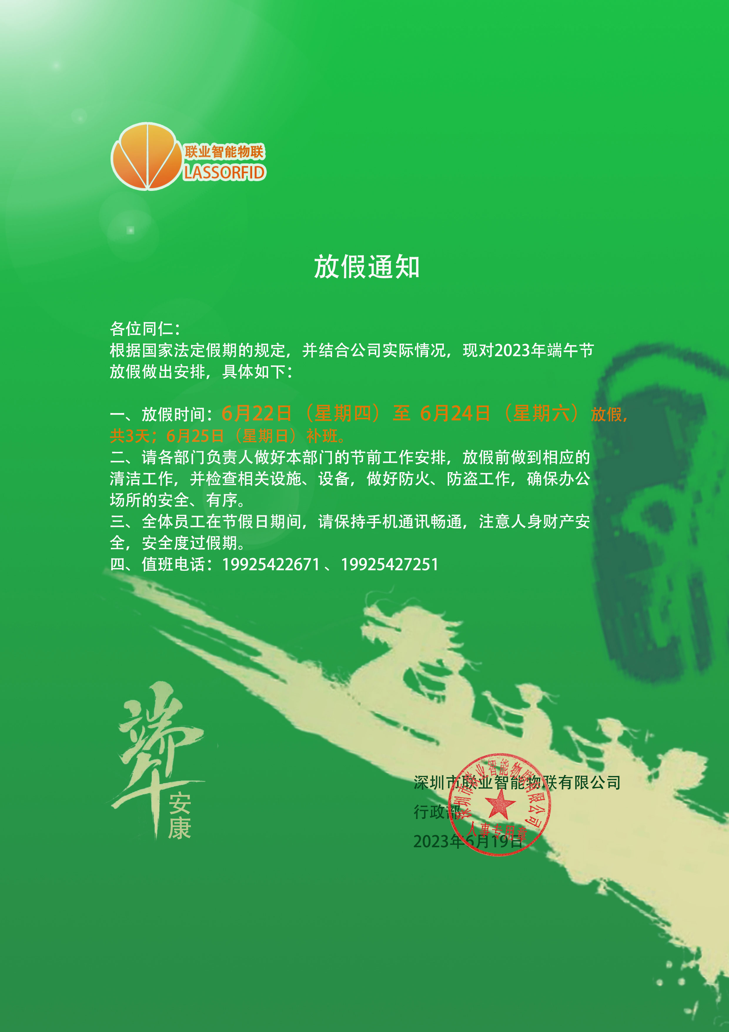 根據(jù)國家法定假期的規(guī)定,并結(jié)合公司實際情況,現(xiàn)對2023年端午節(jié)