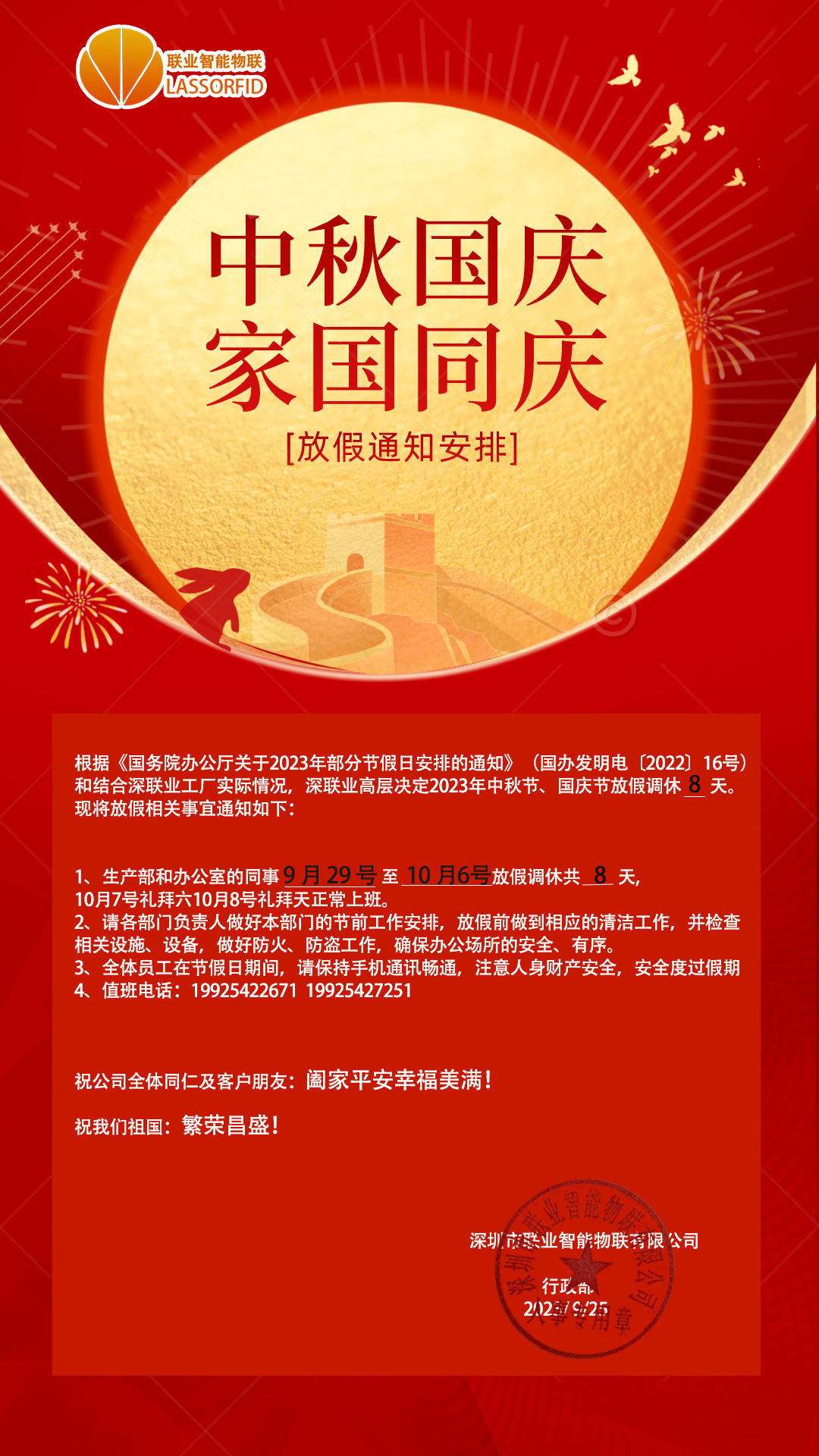 根據(jù)《國務院辦公廳關于2023年部分節(jié)假日安排的通知》(國辦發(fā)明電[2022]16號)和結合深聯(lián)業(yè)工廠實際情況,深聯(lián)業(yè)高層決定2023年中秋節(jié)、國慶節(jié)放假調(diào)休8天。現(xiàn)將放假相關事宜通知如下: