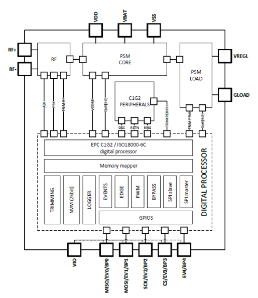 IC芯片具備可配置的SPI端口(主/從)及可配置的功率輸出端口,利用從UHF RF場(chǎng)收集的能量,通過(guò)與外部設(shè)備進(jìn)行通信,用于來(lái)驅(qū)動(dòng)外部設(shè)備工作。