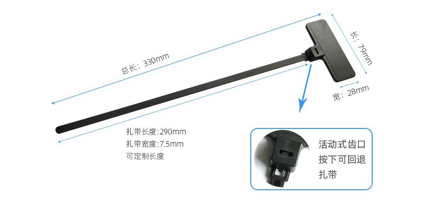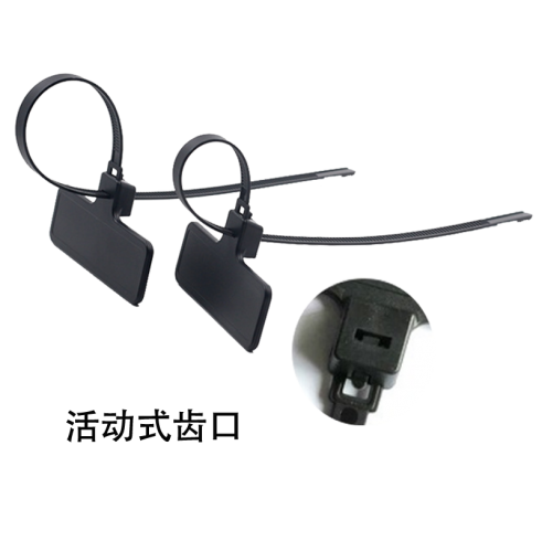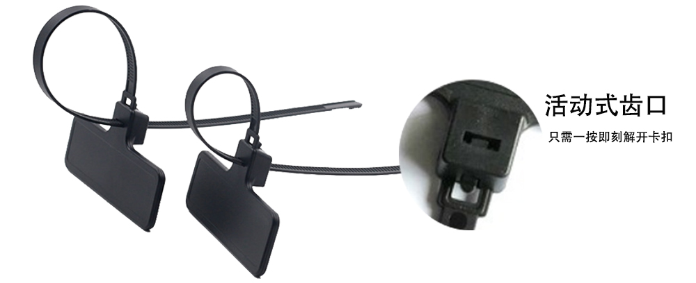 標簽采用活動式齒口,只需按一下可回退(解鎖扎帶)。客戶可根據自己需求在